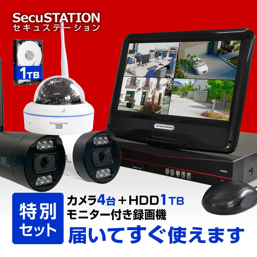 新品未使用 防犯カメラ4台や無線式モニター付きセット 2TBハードディスク付き SecuSTATION 防犯カメラ 屋外 セット 家庭用 ワイヤレス wifi カメラ4